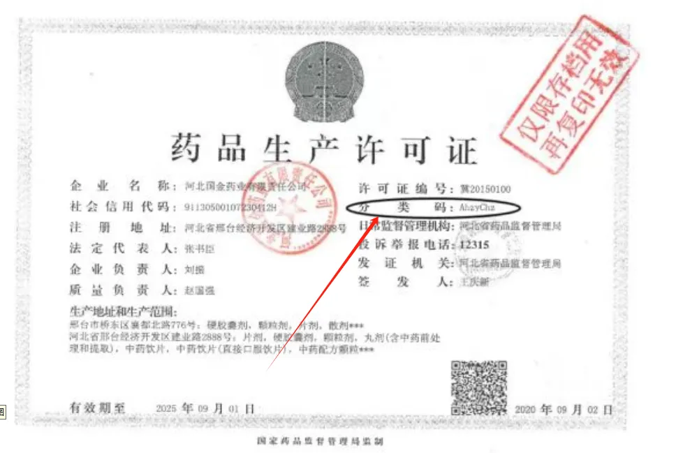 《生产监督管理办法》第七十七条 分类码是对许可证内生产范围进行统计归类的英文字母串。大写字母用于归类药品上市许可持有人和产品类型,包括:A代表自行生产的药品上市许可持有人、B代表委托生产的药品上市许可持有人、C代表接受委托的药品生产企业、D代表原料药生产企业;小写字母用于区分制剂属性,h代表化学药、z代表中成药、s代表生物制品、d代表按药品管理的体外诊断试剂、y代表中药饮片、q代表医用气体、t代表特殊药品、x代表其他。