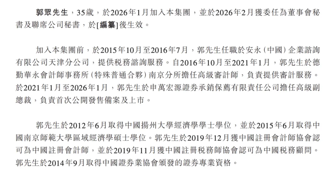 2月13日,南京诺令生物科技股份有限公司(以下简称:诺令生物)向港交所主板递交上市申请,建银国际为独家保荐人。招股书显示,诺令生物于2018年注册成立,专注于一氧化氮吸入(iNO)疗法的研发与商业化应用。依托气液精密控制技术平台,公司已建立起覆盖一氧化氮(NO)发生、传输、检测、储存和临床应用的全链路技术的能力。截至最后实际可行日期,诺令生物拥有5款已获批产品及4款在研候选产品,其核心产品是全球首款获批上市的电化学催化法iNO治疗仪、也是中国首台获批上市的便携式iNO设备,2024年在中国iNO治疗市场按销售收入市占率占比第一。业绩方面,2024年、2025年前9月,诺令生物收入分别为4554.7万元、3156.5万元,年内亏损及综合开支总额分别为8623.3万元、6782万元,毛利率分别为59.3%、49.9%。诺令生物的单一最大股东集团包括毛雯、景宁诺令、曹贵平及令行海南。IPO前,毛雯、景宁诺令、曹贵平及令行海南各自分别直接持有公司已发行股份约7.14%、21.41%、5.35%及0.71%,合共约为34.61%。根据毛雯、曹贵平、景宁诺令及令行海南订立的日期为2021年10月10日的一致行动人士协议,订约各方同意就其作为股东于公司之投票权采取一致行动,若出现意见分歧,则以毛雯的意见为准。据瑞财社查阅,诺令生物递表前夕聘任90后董秘郭众,跳槽自申万宏源证券承销保荐。资料显示,郭众,35岁,于2026年1月加入诺令生物,并于2026年2月获委任为董事会秘书及联席公司秘书。加入诺令生物前,于2015年10月至2016年7月,郭众任职于安永(中国)企业咨询有限公司天津分公司,提供税务咨询服务。自2016年10月至2021年1月,郭众于德勤华永会计师事务所(特殊普通合伙)南京分所担任高级审计师,负责提供审计服务。于2021年1月至2026年1月,郭众于申万宏源证券承销保荐有限责任公司担任高级副总裁,负责首次公开发售备案及上市。郭众于2012年6月取得中国扬州大学经济学学士学位,并于2015年6月取得中国南京师范大学区域经济学硕士学位。郭众于2019年12月获中国注册会计师协会认可为中国注册会计师,并于2019年11月获中国注册税务师协会认可为中国税务顾问。郭众于2014年9月取得中国证券业协会颁发的证券专业资格。