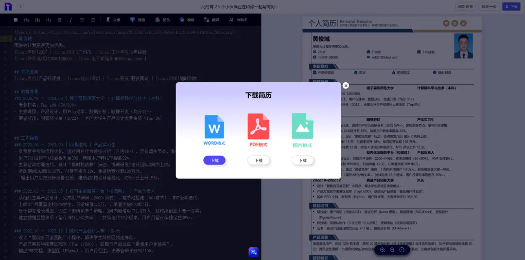 锤子简历推出了AI写简历免费体验,除了会写还会做精美的排版设计(好用的很!)。