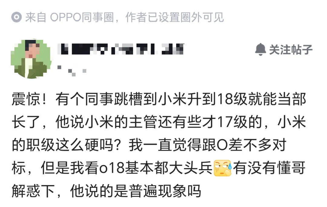 OPPO员工爆料:震惊!有个同事跳槽到小米升到18级就能当部长了,他说小米的主管还有些才17级的,小米的职级这么硬吗?