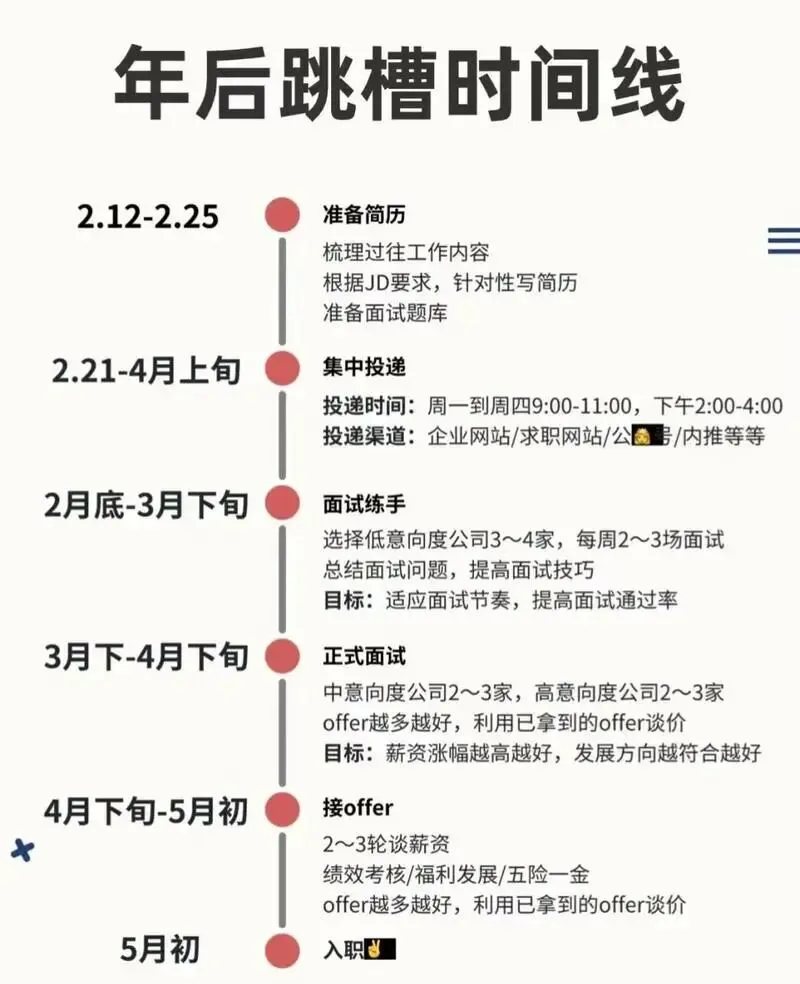 2-4 月抢,是秋招失利的最后救命稻草,春招是补录场,岗位只有秋招的 20%-30%,以中小厂、边缘岗为主,节奏快到离谱。