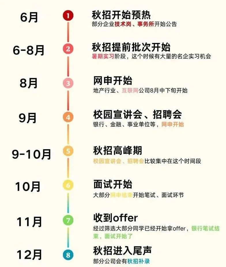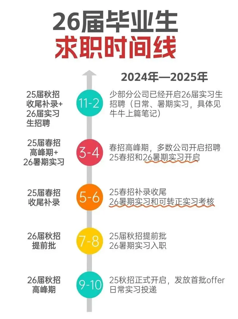 时间线:7 月提前批(捡漏黄金期),8-10 月正式批(笔面爆炸),11-12 月发 offer 收尾。关键提醒:提前批不占正式批名额,闭眼投!很多人等金九银十,7 月投的人已经拿 offer 了。人群:应届毕业生,这是进大厂、拿高薪的唯一最优解,别指望春招兜底。春招
