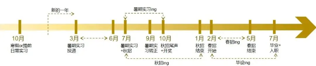 3-5 月投,7-9 月干,校招的提前上岸券。别等毕业再找工作,实习才是校招的第一战场。3-5 月是大厂暑期实习投递高峰,字节、腾讯、阿里这批岗,转正率能到 60%-80%,等于提前拿正式 offer。时间线:3 月启动网申,5 月集中发 offer,7 月入职,9 月答辩转正。核心逻辑:实习 = 免笔试直通秋招终面,没实习的应届生,秋招简历直接被 AI 筛掉一半。避坑:尽量别找小作坊日常实习,只投有明确转正 HC 的暑期岗,不然等于免费打工,当然如果你没能力,小作坊也要去,有生产级项目经验对你秋招是加分项秋招