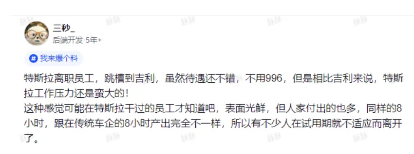 前段时间看到一个后端开发5年经验的人发帖,说自己是从特斯拉离职跳槽到吉利的。