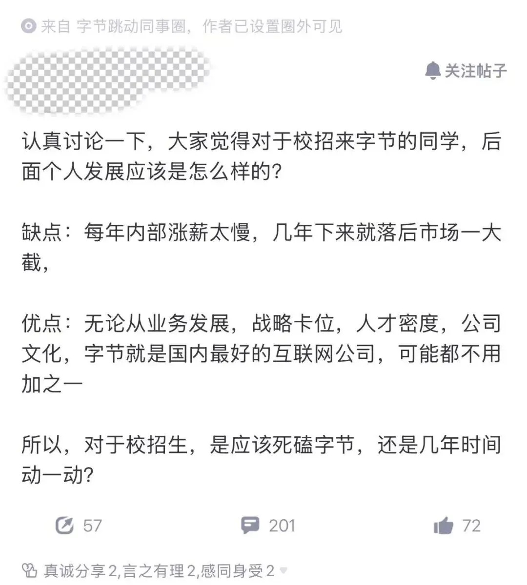 今天知予在脉脉上刷到一位字节员工的发文:对于校招生进字节,到底是在字节死磕深耕,还是趁早跳槽去外部寻找新机会?