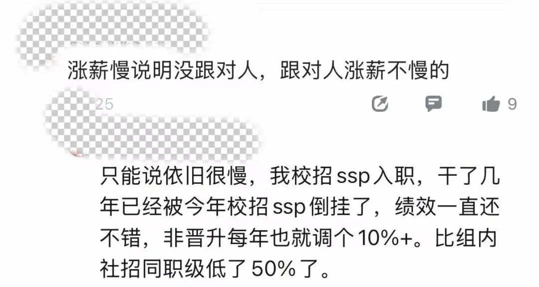 也有人说:涨薪慢可能是因为没跟对人。他说自己校招ssp入职,干了几年绩效一直不错,但非晋升年份每年也就调薪10%左右,现在已经被今年的校招ssp倒挂了,比组内社招同职级低了50%。这种情况确实让人有点扎心。