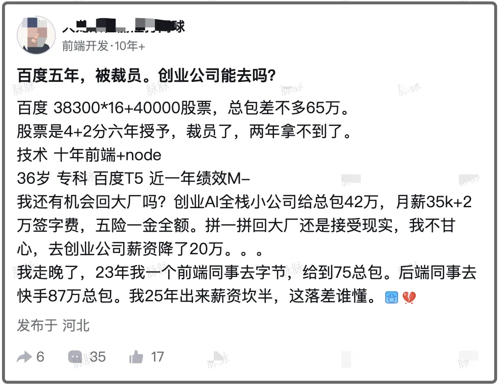 36岁的前端工程师,在百度工作十年以上,职级到T5级别,最终因为绩效M-而被优化。他的总包约65万(38300×16薪+4万股票),但股票是4+2分六年授予,裁员后未来两年已无法兑现。