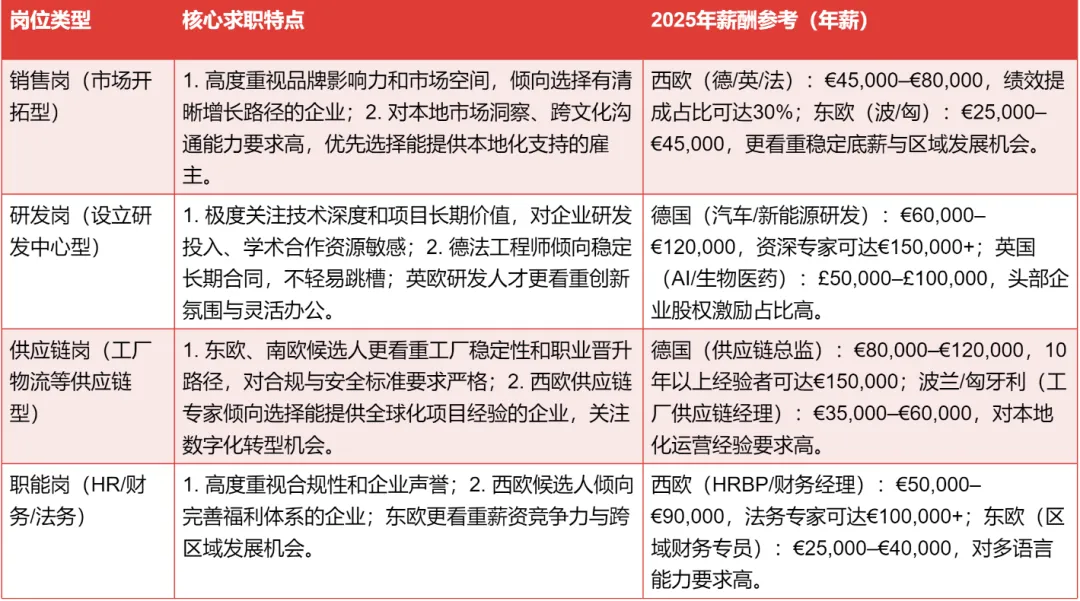 以上为《白皮书》调研平均水平,实际薪酬受企业规模(大企业高15%-25%)、人才能力(双语、合规经验、核心技术)影响较大。复合型人才薪资溢价可达30%-50%。此外,欧洲企业福利成本约占薪酬总额的25%-35%,中企招聘时需综合考量。