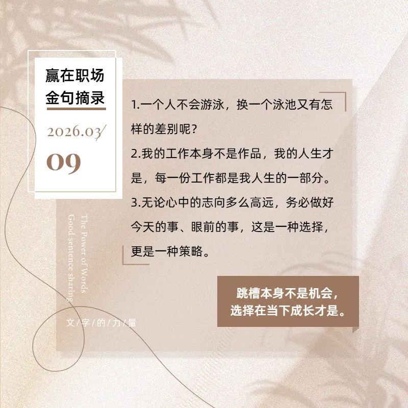 如果当下困境源于能力短板、心态浮躁,那么换个环境,同样问题只会以新形式再现。跳槽本身不是机会,在当下挑战中选择成长,才是AI时代最稀缺的职场资产。