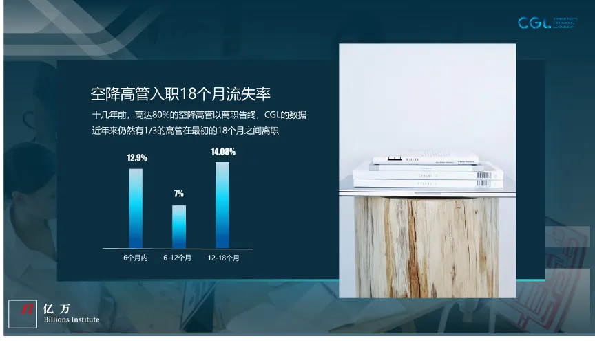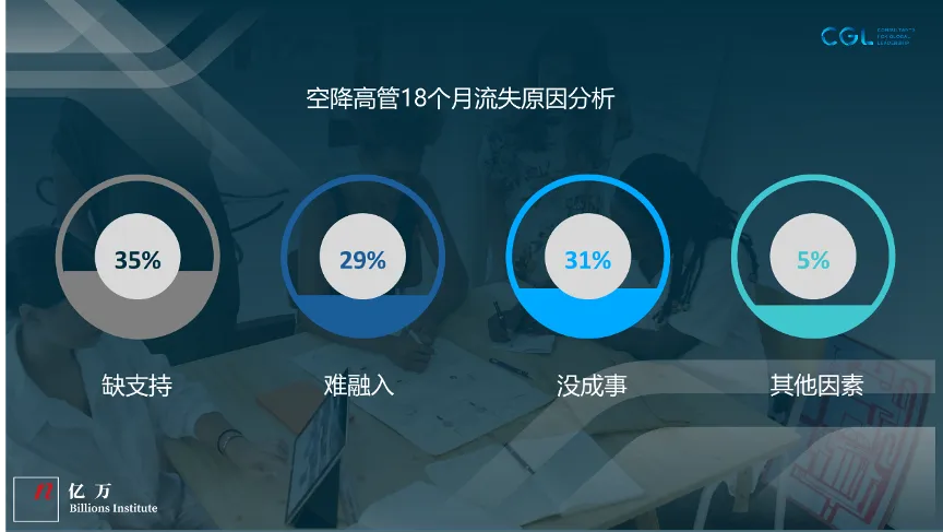 创业公司引进高管,真实的伤亡率是怎么样的呢?CGL算是做得比较好的猎头公司了,但是CGL在跟踪了600多位空降高管,并分析了他们入职18个月之后的数据之后,我们可以看到有将近三分之一的高管还是流失了。