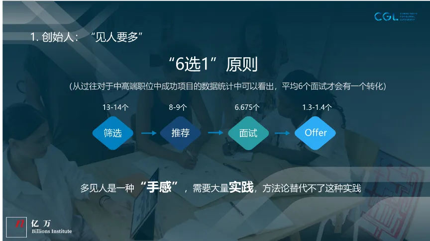 首要的就是见人一定要多,多看点人。20多年的经验和数据明证了,成功的人才筛选往往来自于一定数量的面试、一定数量的挑选、一定数量的评估。一个比较典型的成功用人漏斗大概如此:外部招聘高管时,猎头公司会访寻到13、14个人选,然后推荐其中的8、9个人选,其中6个左右被面试,然后最后一个人会被offer。