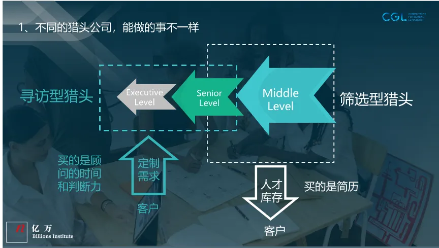 根据候选人人群划分,猎头面向的主要有三个群体:中级管理人员、高级管理人员、管理层人员。而根据这样的人群,猎头大概可以分为两种类型:筛选型猎头和寻访型猎头。