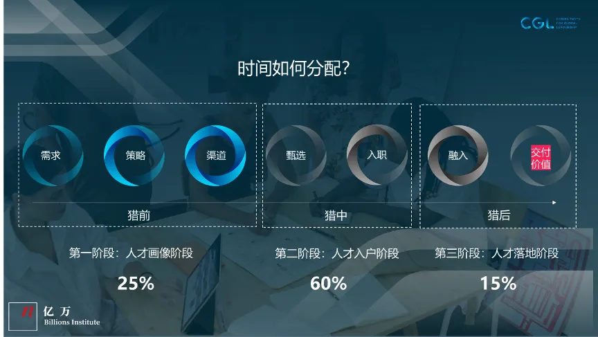 第三个阶段:人才落地。再次强调,入职不应当是猎头工作的终点。优秀的猎头应当在这个环节投入的时间大概在整个项目的15%左右,去帮助入职者生根、发芽、结果。