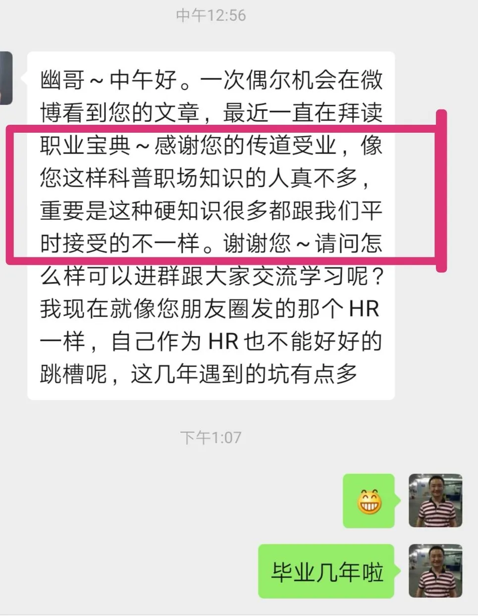 如上截图这样每天来赞扬我的读者,十来个,那些“忏悔人生”的就更多了,我都不高兴截图。实际上他们忏悔的内容,就是我的文章、视频分享出来的共性知识的盲区,是这个社会有意回避不告诉你的知识点。我真正的第一篇代表作,也叫做《扫盲贴,一贴让你跳槽概率增加到80%》,大概在2010年发表在天涯论坛上。