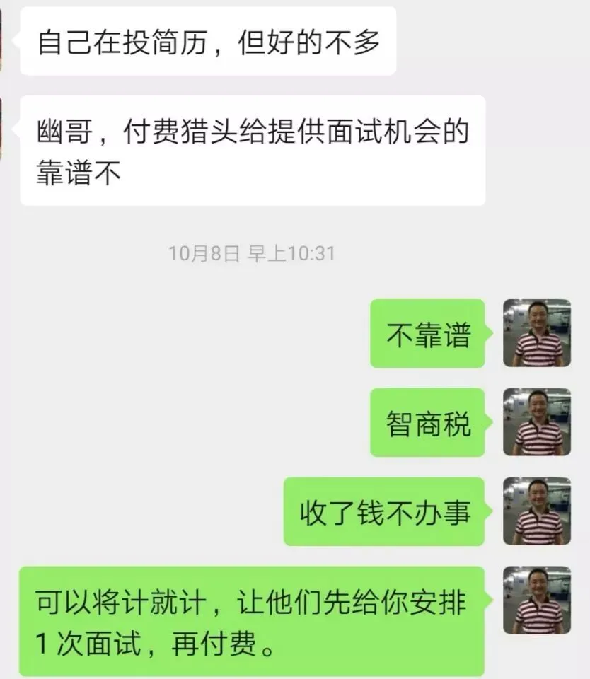 这里有个概率区分,不收费猎头如果说靠谱率是50%,那收费猎头靠谱率大致就只有5%了,你心中有数。
