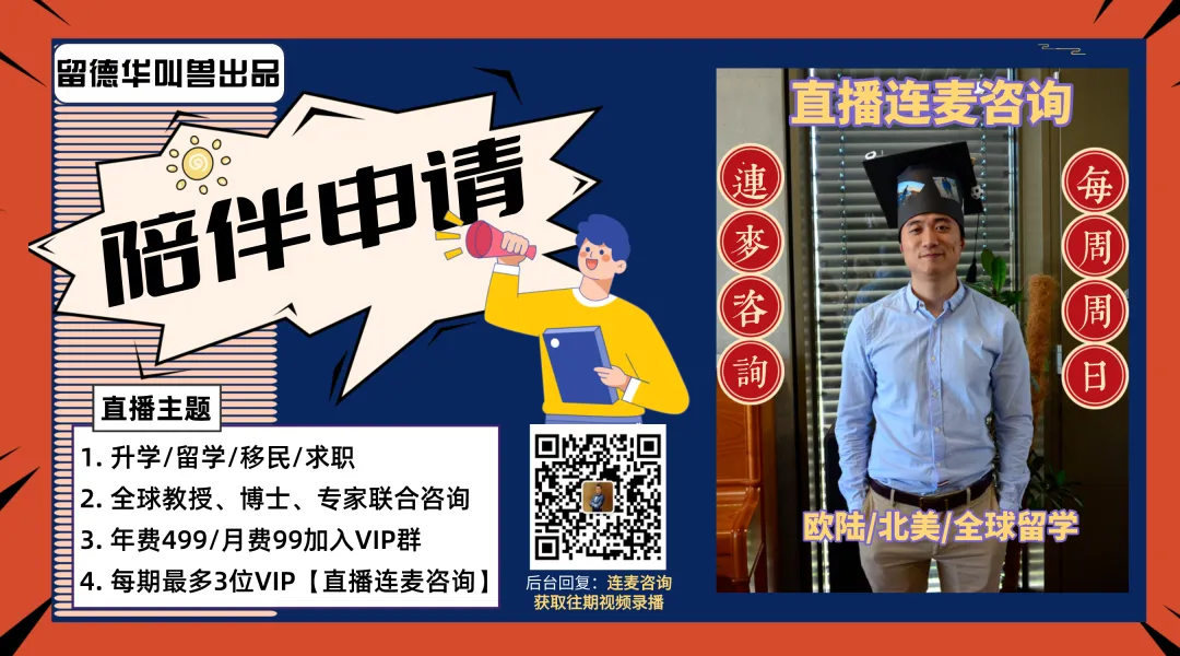 详情见:【留德华叫兽VIP群】:欧洲/北美/全球留学移民咨询&教授专家视频直播连麦咨询
