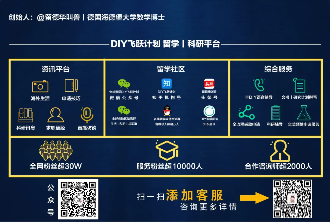 都欢迎你扫码关注我在德国海德堡大学读博期间创办的【DIY飞跃计划】留学|科研社区,让1000+全球海外硕博咨询师帮助你实现飞跃!