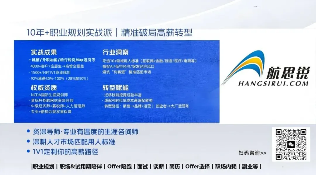如果你或者你朋友,想要期望有更好职业发展或转行航思锐职伴:一站式职场陪伴,助你斩获理想Offer,添加微信:Hsrzb0806,预约对应职业规划(方向定位/转行转岗/升职加薪等)、职场陪伴服务(试用期陪伴/年度职场陪伴)、全程服务(社招&校招Offer陪跑等)、求职服务(面试辅导/简历撰写等):