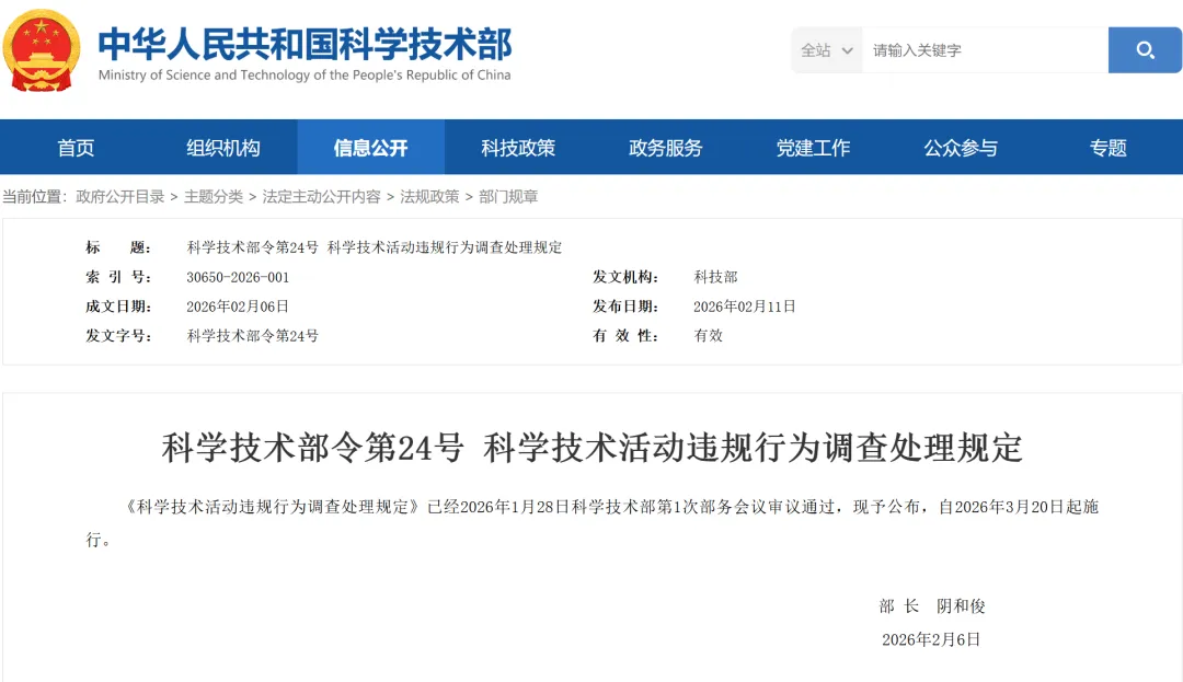 2026 年 3 月 20 日,科技部《科学技术活动违规行为调查处理规定》(科技部令第 24 号)将正式施行,人才计划入选者、重大科技项目负责人在支持 / 聘期 / 项目执行期内擅自变更单位,被明确列为违规行为。这一规定是对 2020 年暂行规定的系统性完善,以清单化管理筑牢科研诚信红线,对科研人才流动与项目管理形成刚性约束。