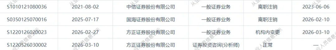 刘力维,2月10日从国海证券离任,2月27日加入方正证券,3月10日成为分析师