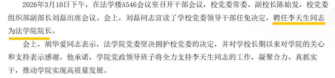 南昌大学法学院聘任了一位新院长!且这位新院长同样来自211大学,只不过不是综合性211大学,而是行业性211大学大连海事大学!长期以来,因距离遥远,南昌大学与大连海事大学在人才交流方面交集不多。其一,李天生教授本硕均毕业于南昌大学,博士毕业于大连海事大学,与这两校均有很深的渊源,同时,他在大连海事大学已经工作多年,担任过副院长,在我国法学界也有一定影响力。其二,南昌大学是综合性大学,但法学领域亟待突破,但在省内依旧面临江西财经大学等校的激烈竞争,需要一位资深学者来引领发展,此外,李天生教授回归母校担任法学院院长 ,对于江西法学界也是巨大利好,大连海事大学是我国法学界强校之一,海商法、国际法等学科领域拥有全国一流实力,是我国低调的法学强校之一。李天生教授在大连海事大学法学院属于骨干学者,他的到来对于江西法学界而言都是重大利好!