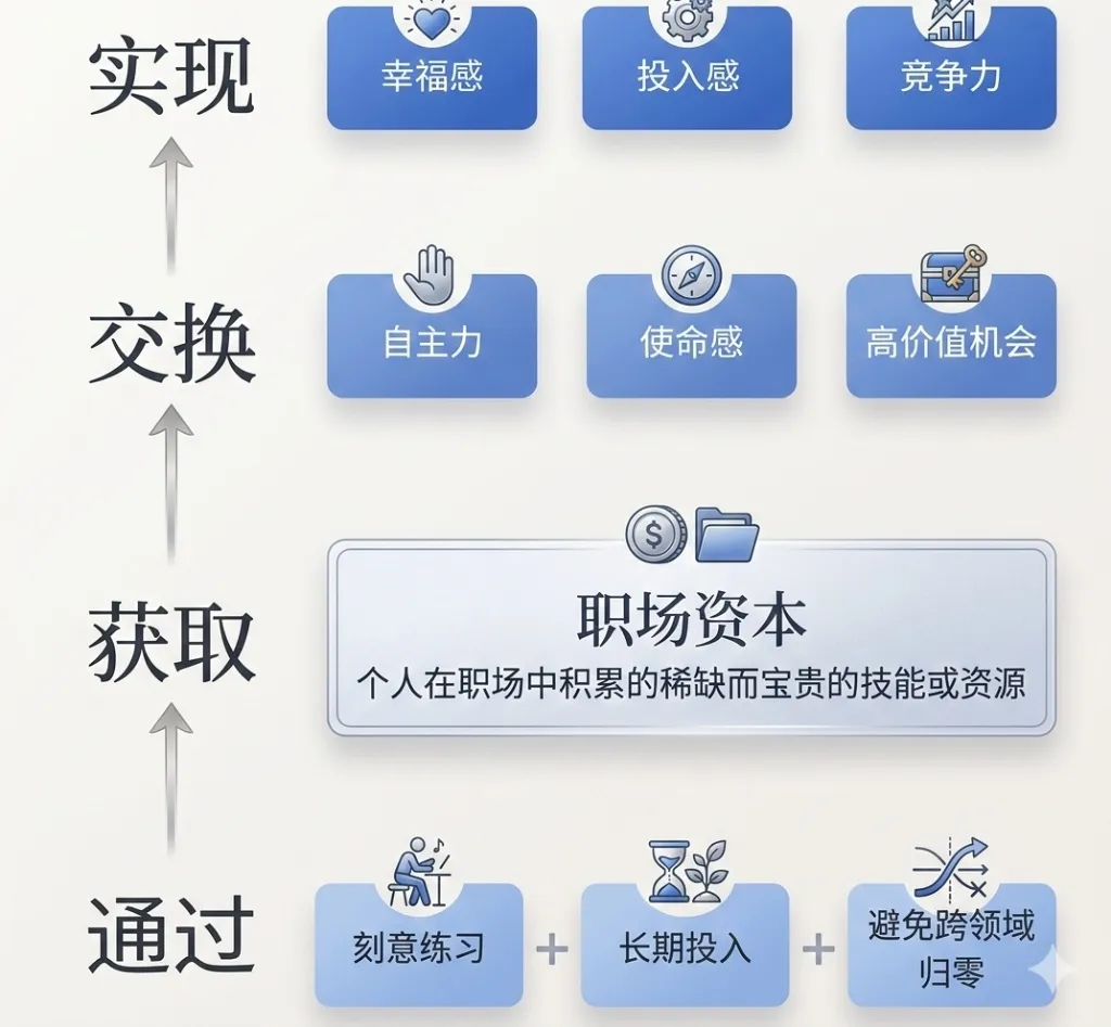 当你拥有了足够的职场资本,你才拥有了“话语权”。这时候,你可以开始用资本去交换你想要的生活方式。图中列出了三个关键点:自主力、使命感、高价值机会。这是职业幸福感的最高来源。 当你足够优秀,你可以决定在哪里工作、什么时候工作、以什么方式工作。警告: 很多人在资本不足时就强行索要自主力(比如过早创业或裸辞做自由职业),这通常会导致财务崩溃。记住,先有资本,后有自由。使命感不是在冥想中“想”出来的,而是在你拥有大量职场资本后,在领域边缘发现的“新大陆”。 只有当你站在行业的前沿(也就是你积累了足够资本的地方),你才能看清未来的方向,从而找到那个值得你奋斗一生的使命。3. 高价值机会(High-Value Opportunities)随着资本的积累,你会发现以前求而不得的机会开始主动找上门。这时候的挑战不再是“没机会”,而是“如何拒绝那些平庸的机会,专注于那个能产生10倍价值的赛道”。