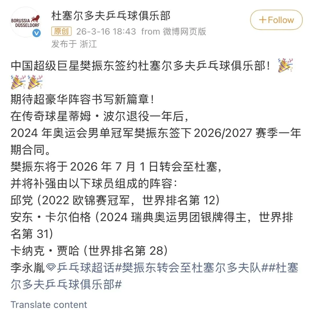 昨天一则新闻是关于樊振东转会到新俱乐部,他将在2026年继续留在德国打乒乓球。
