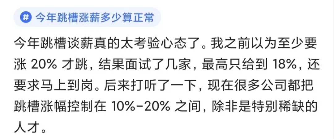 后来他打听了一下,发现现在很多公司都把跳槽涨幅控制在10%-20%之间,除非是特别稀缺的人才,否则基本就是这个区间。