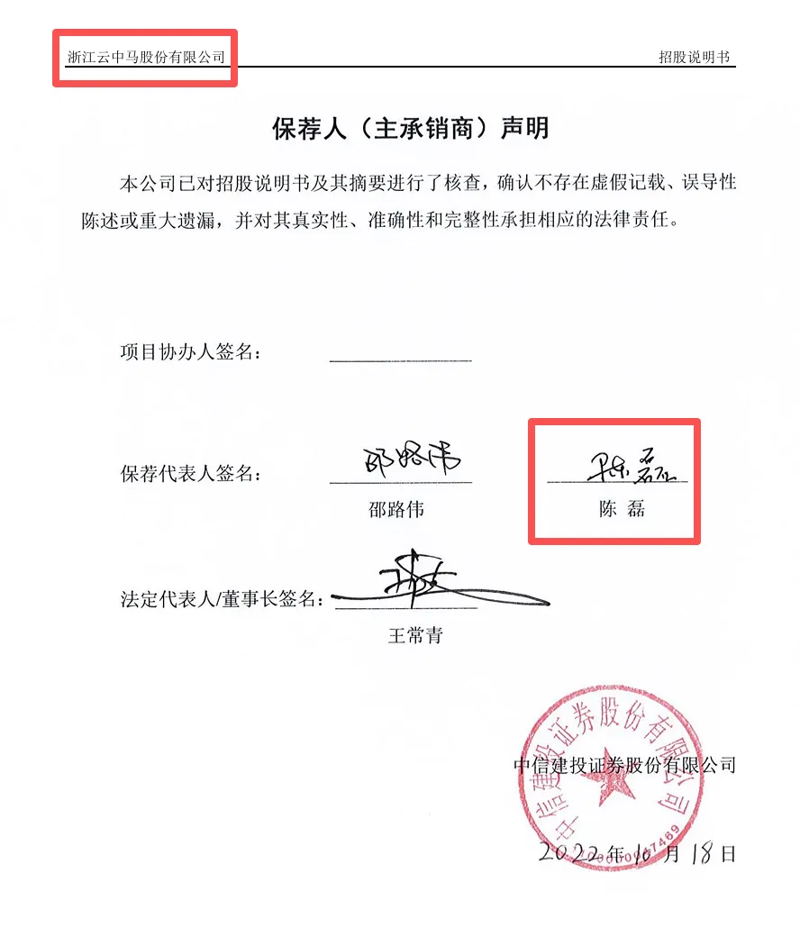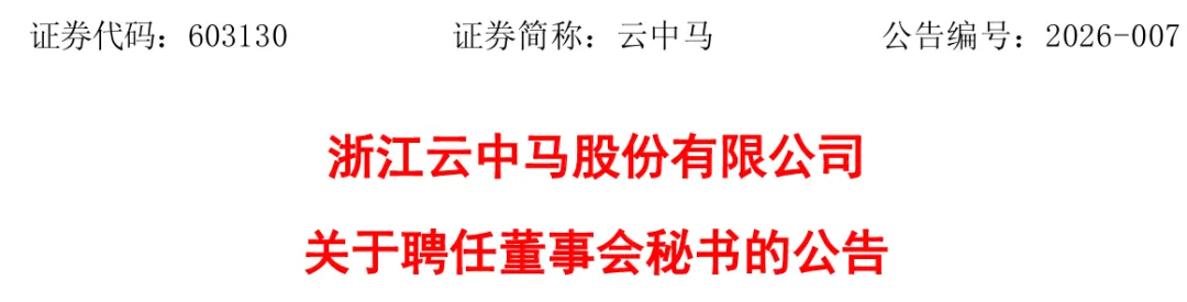 2026年3月19日,云中马召开第四届董事会第三次会议,同意聘任陈磊(简历附后) 为公司董事会秘书。值得一提的是,陈磊正是云中马IPO签字保荐代表人。陈磊,男,1990年出生, 研究生学历, 具备保荐代表人资格。 主要工作经历: 2015年7月至2025年11月, 就职于中信建投证券股份有限公司投资银行委员会, 任高级副总裁; 2025年12月就职于浙江云中马股份有限公司投资部。