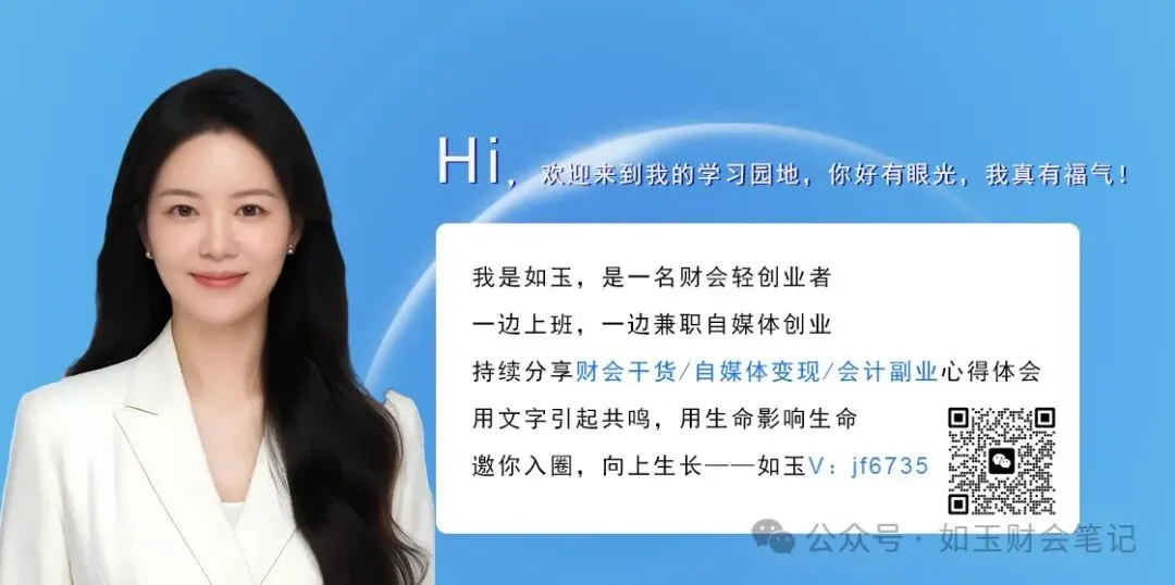 如玉,中级会计师,财会轻创业者,多个评标专家库成员,财务IP孵化基地成员、粥左罗顶峰会成员、全国会计副业圈合作伙伴。