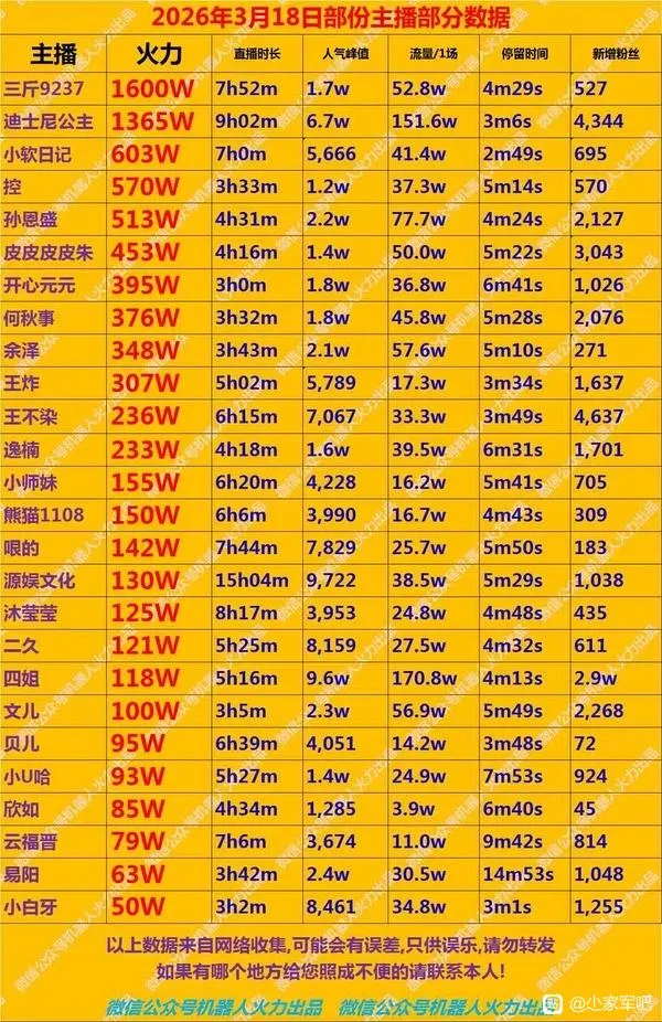 昨天的各大主播数据,三斤的收入依旧是位列第一,迪士尼位列第二,两人也是都超过了千万抖币的收入。对于停留时间来说,可能橘子和文儿、小u哈都比较高,估计他们粉丝的粘性比较高,粉丝凝聚力强,喜欢看他们的直播。老葛到Gou磊直播间连麦安慰,聊起刘一手,说其以前是10W+人气主播,没破釜沉舟亏钱的决心就只能剩3000人气。老葛还表示自己贴钱办比赛备奖品拉流量,大家各凭本事争,自掏腰包上票是个人意愿他不管。这时有网友公屏问老葛没被抓呀,老葛含沙射影称自己在美国跑着没被抓。Gou磊直接点名说问的是辛8吧?老葛见状紧急挂麦,Gou磊大笑调侃辛8在美国。由于王小源已经很长时间没有直播了,并且跟快手在对峙,有粉丝询问老利,王小源是不是要来抖音直?老利表示自己不清楚,估计很难来这边,因为快手那边估计不会放他过来。