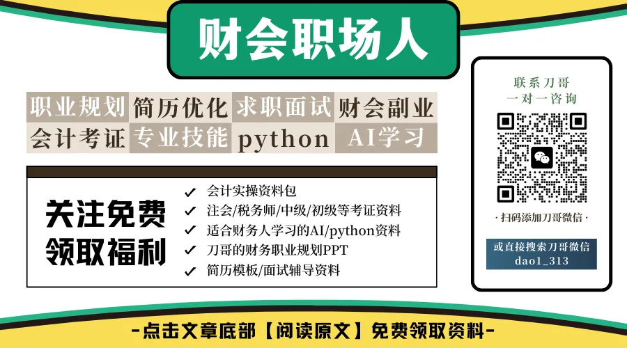 刀哥打造的AI助手——财务类岗位简历优化AI助手和财务AI求职面试官,免费不限次随时使用,助力拿offer,使用地址见文末左下角【阅读原文】链接内第7项资料,有什么疑问需要交流的,可以找刀哥。