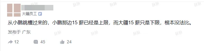 这个差距有多大?假设两个人 base 月薪都是3 万,在小鹏拿 15 薪就是全年45 万,但这是上限,大多数人可能只有39 万到 42 万(13 到 14 薪)。