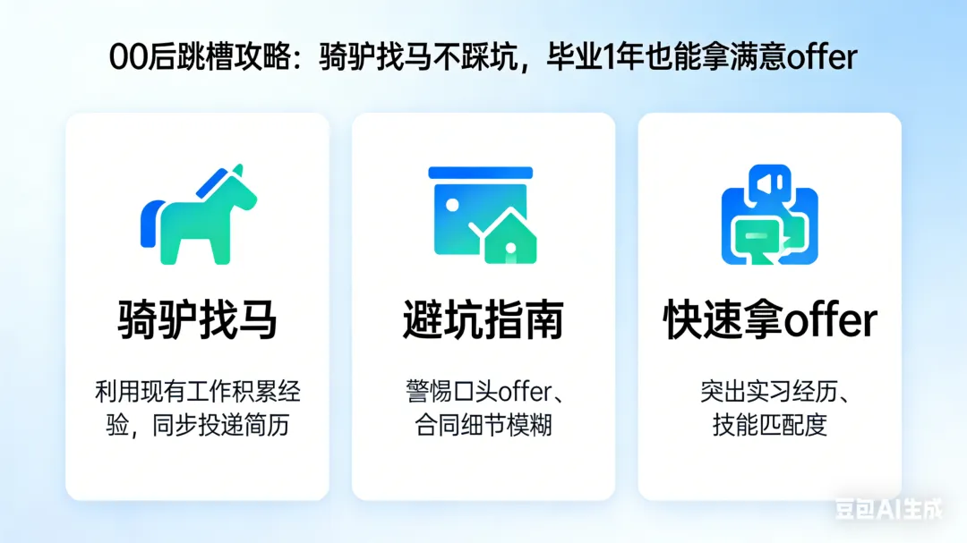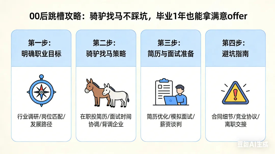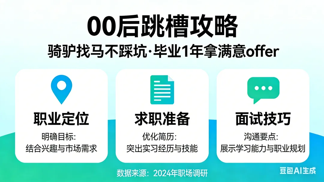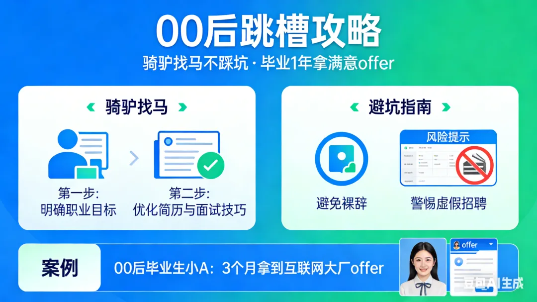 其实跳槽不可怕,可怕的是 “盲目跳槽”。00 后跳槽,要的不是 “赶紧逃离”,而是 “精准破局”。这一篇,把跳槽全流程避坑指南一次性给你,从骑驴找马的隐藏技巧,到简历优化、面试话术,再到离职收尾,每一步都讲透,让你不内耗、不踩坑,轻松拿到满意 offer。