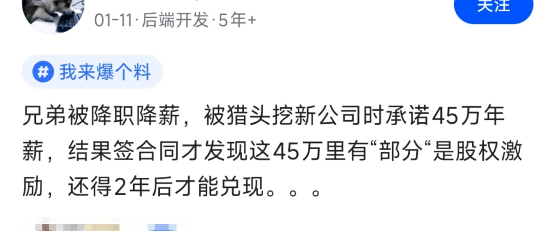 职场坑点提醒昨天跟发小喝酒,他跟我讲了个刚发生的糟心事:他表哥本来在原公司被降职降薪,正愁着找下家的时候,猎头找上门来,说新公司开出了45万年薪的待遇。表哥一听就动了心,没过多久就从原公司离职了,结果签合同时才发现,这45万里有近一半是股权激励,而且必须满2年才能兑现。