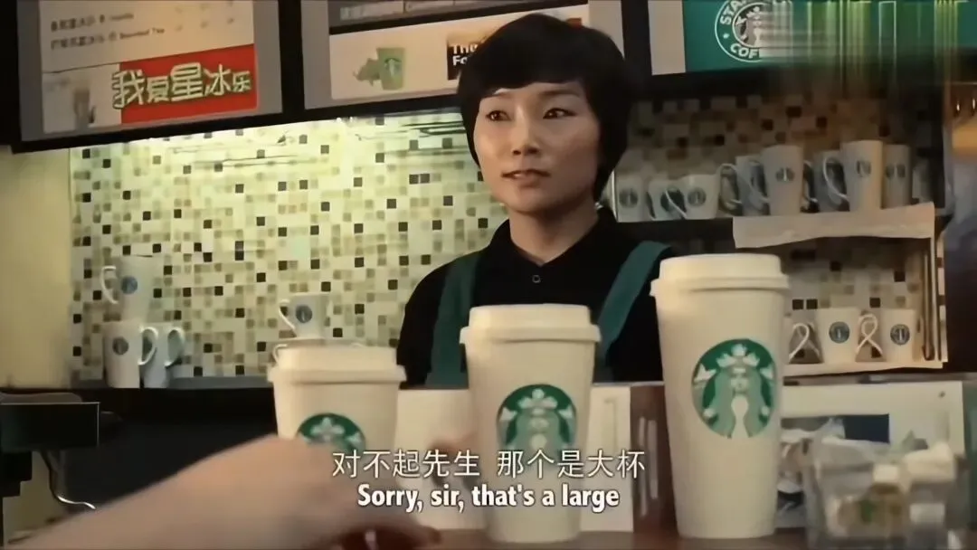 视频里,罗永浩作为星巴克的顾客,在前台点单时想要柜面上从小到大摆放的三个杯子里的“中杯”,也就是中间那个,但是被星巴克女店员无情拒绝了,指着杯子纠正他:“对不起先生,那个是大杯,这个才是中杯。”