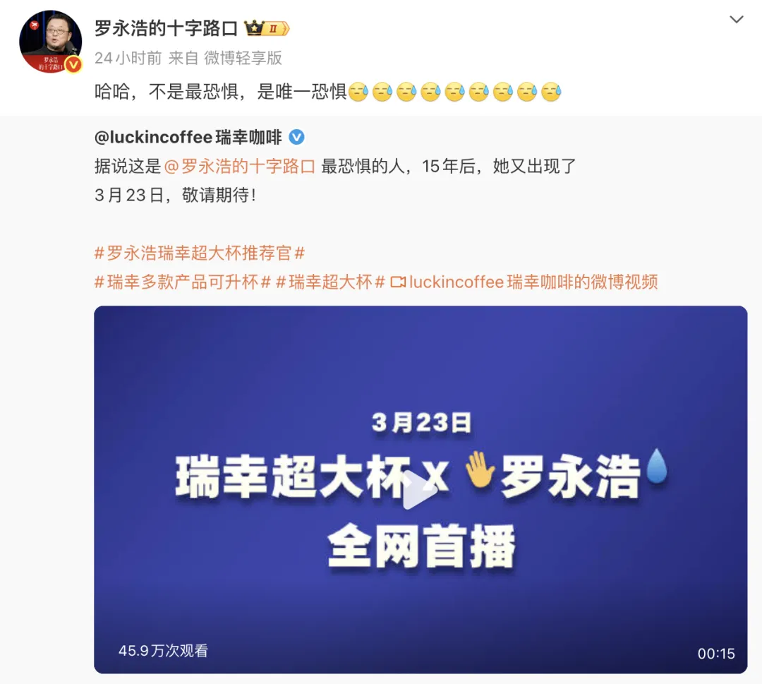 预告片的时候,瑞幸就已经拉满了噱头:“据说这是罗永浩最恐惧的人,15 年后,她又出现了”,罗永浩转发:“不是最恐惧,是唯一恐惧”,疑似回应网友们的玩梗“罗永浩的唯一败绩”