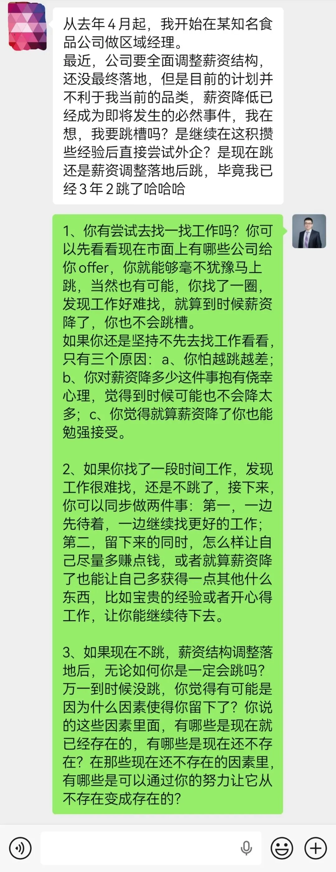 3、如果现在不跳,薪资结构调整落地后,无论如何你是一定会跳吗?万一到时候没跳,你觉得有可能是因为什么因素使得你留下了?你说的这些因素里面,有哪些是现在就已经存在的,有哪些是现在还不存在?在那些现在还不存在的因素里,有哪些是可以通过你的努力让它从不存在变成存在的?