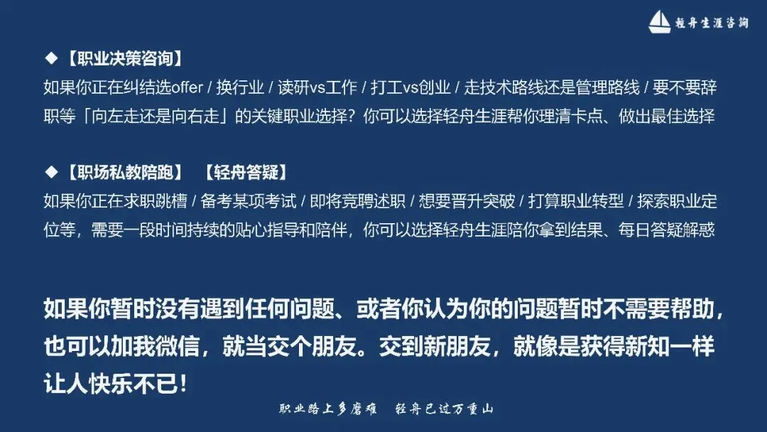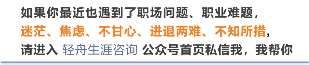 ● 如果你正在面临职业发展中的关键决策,不知道向左走,还是向右走,点击职业决策咨询,我和你一起探路,帮你穿过迷雾,真正看清最适合你的那条出