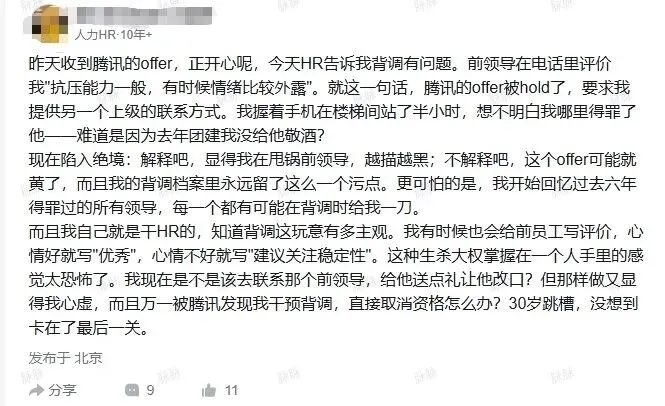 网上流传的一张脉脉截图,我看了,破防了。一个10年+的资深HR,拿到腾讯offer当天,就因为前领导一句“抗压能力一般,情绪比较外露”,被卡在背调环节。他在楼梯间站了半小时,想不通自己哪里得罪了前领导,甚至怀疑是不是去年团建没给对方敬酒。我干了20年大厂管理,见过太多这样的事。职场里没有对错,只有人情。你以为凭能力就能站稳脚跟,结果往往是一句不经意的话,一个没做到位的细节,就能毁掉你几年的努力。