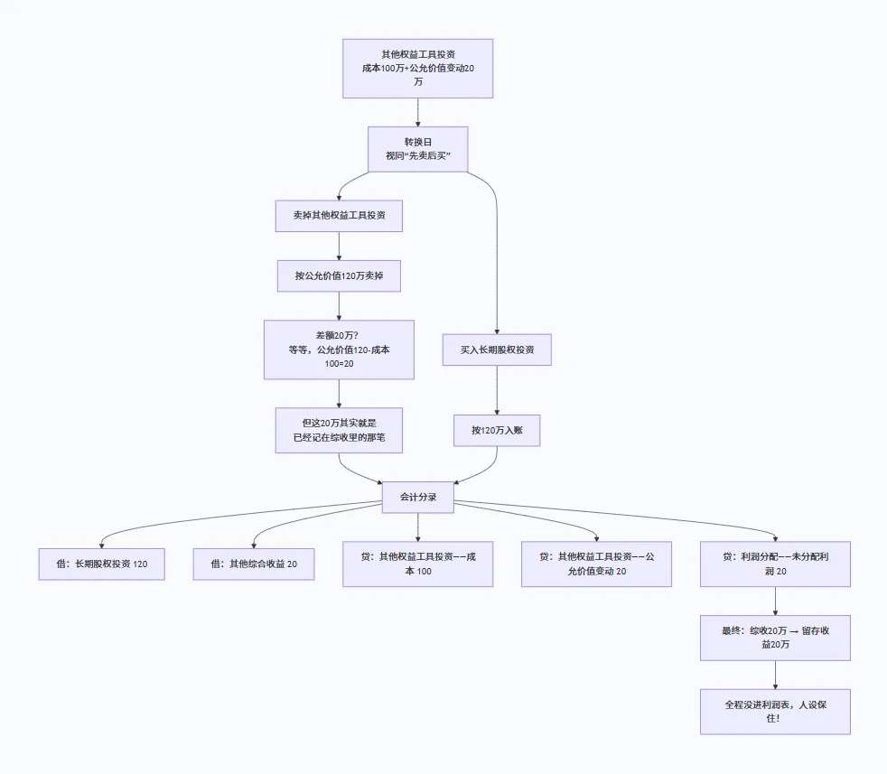 这个转换让很多同学懵圈:其他权益工具投资的公允价值变动不是记在其他综合收益吗?转成长投了,这笔钱不应该转进投资收益吗?