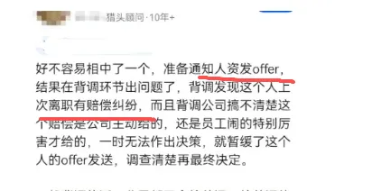 前两天刷到一个猎头发的帖子,说他们好不容易帮公司找到了一个合适的候选人,各方面都对上了,准备发offer了,结果背调这一关,发现这个人离职的时候有赔偿纠纷,offer直接取消。