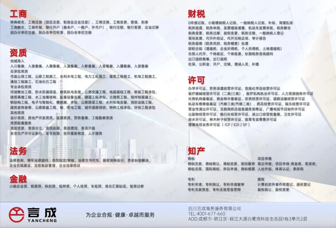 专注成都企业服务10年,为创业者提供专业可靠的一站式解决方案。我们拥有资深财税团队和丰富的本地服务经验,熟悉成都各区域政策和办事流程,能够高效办理公司注册、代理记账、财税合规、许可代办等业务。