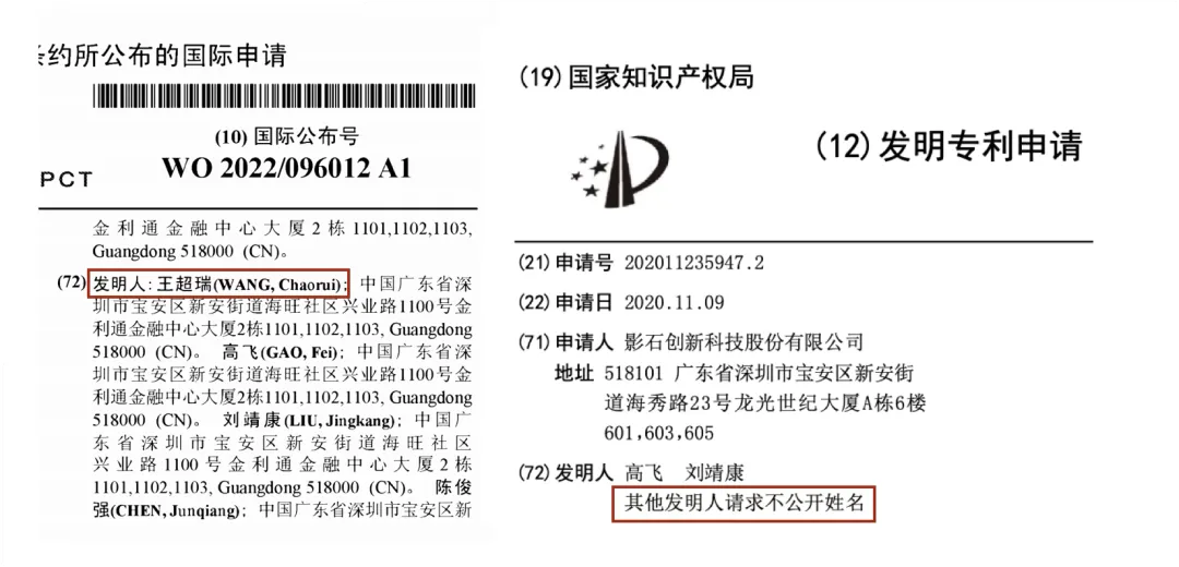 在涉及无人机飞行控制和结构设计的两项专利中,影石在中国的申请文本里将部分发明人标注为"请求不公布姓名"。
