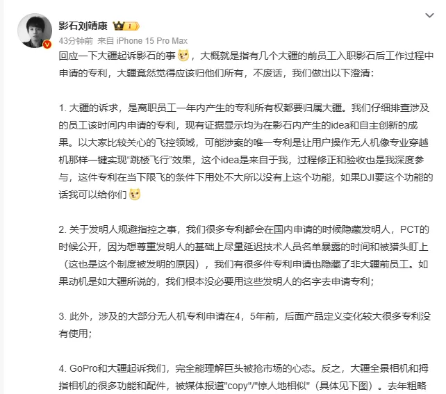 影石创始人刘靖康在社交账号上发布了一份长达八点的详细回应。
