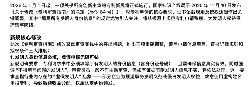 值得注意的是,2026年起实施的新规进一步强化了源头管控,国家知识产权局明确要求所有专利申请必须完整填写发明人身份证号与任职履历,否则将不予受理或视为形式缺陷,从制度层面杜绝权属争议漏洞。也就是说,类似"隐藏发明人"的操作空间,在新规下已大幅收窄。