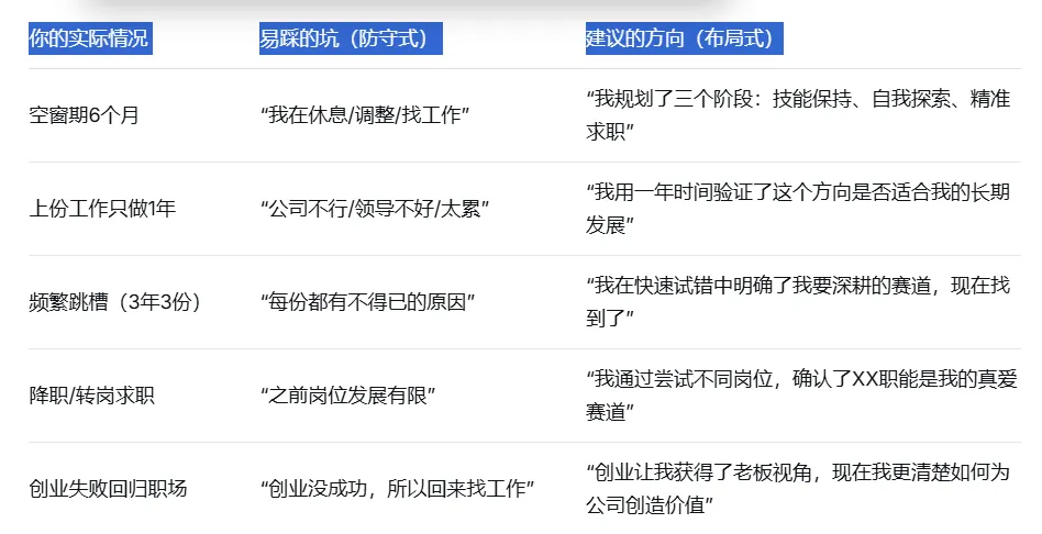 新手候选人的思路是:“我必须解释清楚那段空窗期/那次短暂任职,让面试官理解我。”
