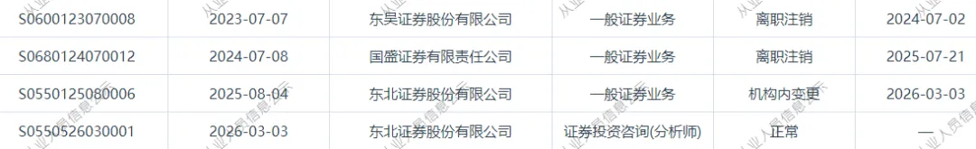 近日,证券从业系统显示,廖岚琪,2025年7月21日从国盛证券离任,8月4日加入东北证券,26年3月3日晋升为东北证券分析师。廖岚琪,计算机行业分析师,南洋理工大学硕士,2年卖方从业经验,此前在东吴证券、国盛证券从事煤炭行业研究。