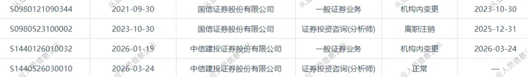 近日,证券从业系统显示,年亚颂,2025年12月31日从国信证券离任,1月19日加入中信建投证券,3月24日变更为中信建投分析师。