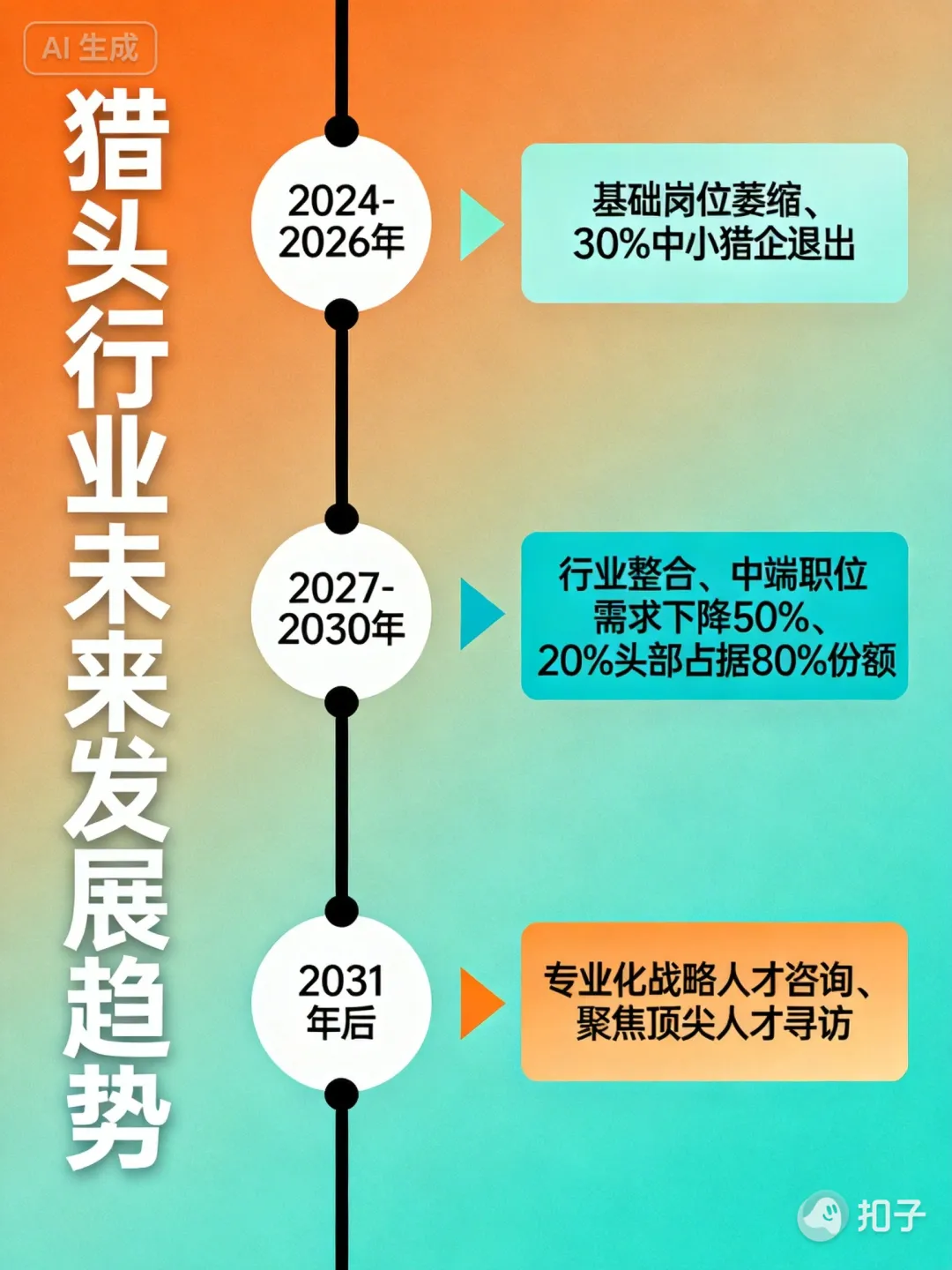 2026年的猎头行业,淘汰的不是传统模式,而是不愿进化的猎头公司。AI替代的是低效劳动,价格战击垮的是无价值服务。猎头行业的未来发展方向清晰可见: